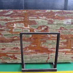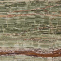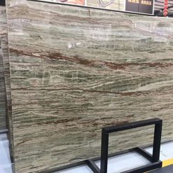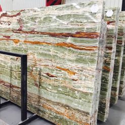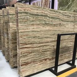 Đá onyx Bamboo Green xuyên sáng với các đường vân nâu, xanh, trắng, kem xen kẽ song song, tạo nên tấm đá nhẹ nhàng nhưng không thiếu phần ấn tượng. Đây là dòng đá phù hợp các hợp mục trang trí, với khả năng xuyên sáng, chúng tạo nên vẻ đẹp sang trọng cho gia chủ