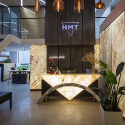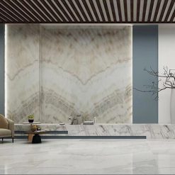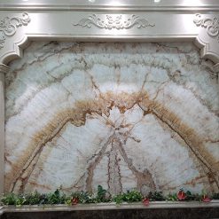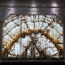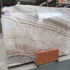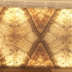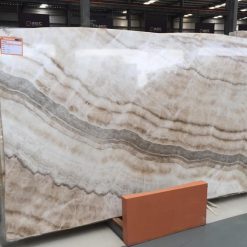 Đá xuyên sáng Beige Onyx với nền đá màu sắc trắng kem, các đường vân nâu đậm chạy song song, uốn lượn tạo nên các dải vân ấn tượng trên bề mặt đá. Dòng đá này kết hợp với hệ thống đèn tạo nên vẻ đẹp cực kì ấn tượng, thu hút.